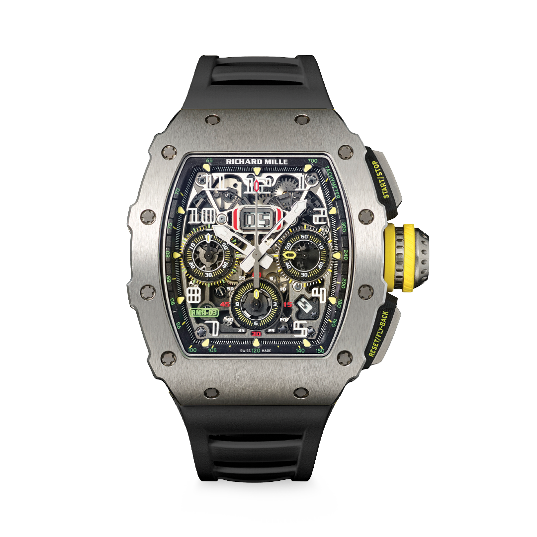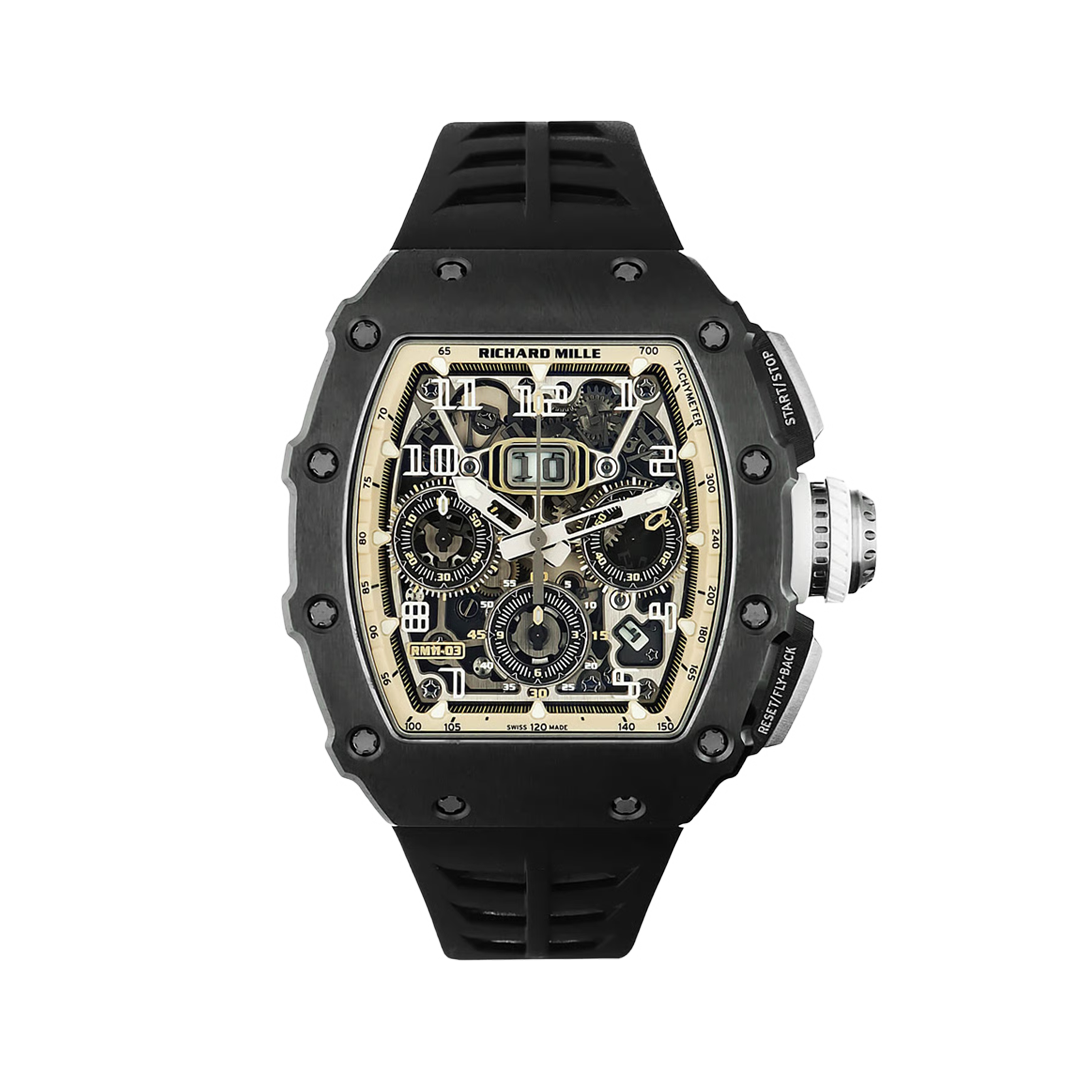 RM011-03 Chrono Ti merupakan salah satu model chronograph paling populer dari Richard Mille dengan casing titanium ringan dan desain tonneau ikonik.